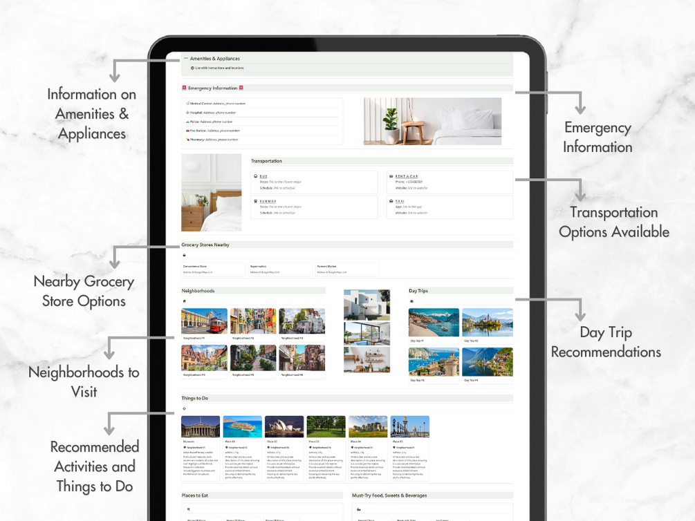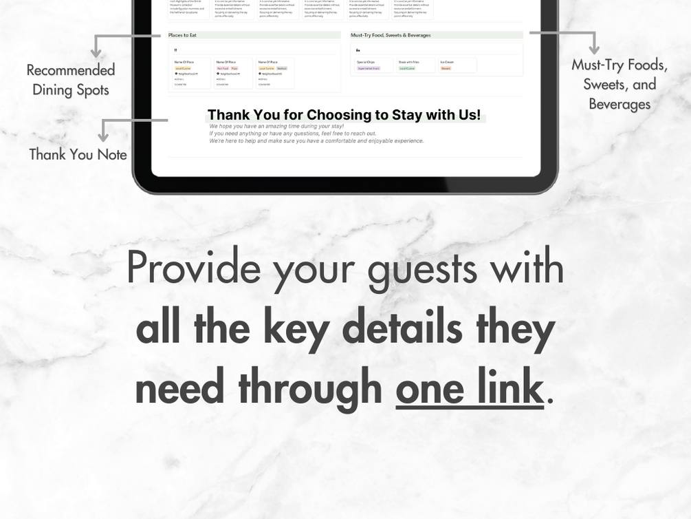 - Fully customizable in Notion: Tailor the guidebook to reflect your property’s unique personality and amenities.
